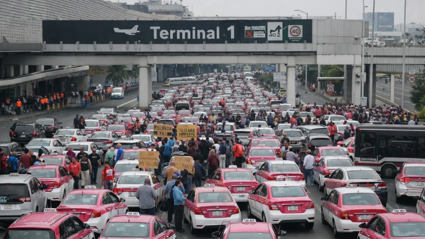 Los taxistas autorizados del Aeropuerto Internacional de la Ciudad de México bloquearon los accesos principales de las terminales 1 y 2 para protestar contra la operación de servicios de transporte por aplicación como Uber y Didi dentro del aeropuerto.