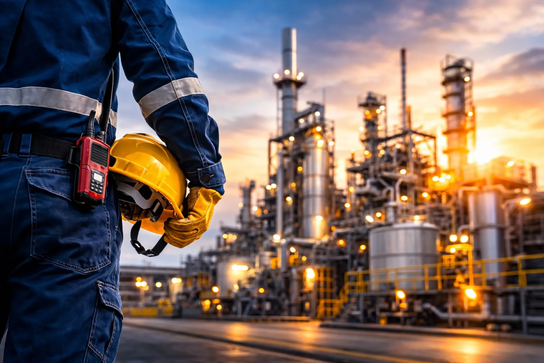 Trabajador aislado en industria química con dispositivos de monitoreo