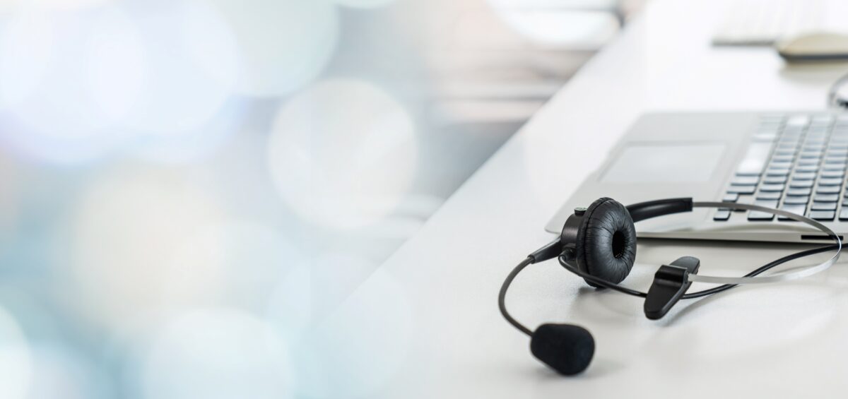 Audífonos de call center junto a computadora portátil